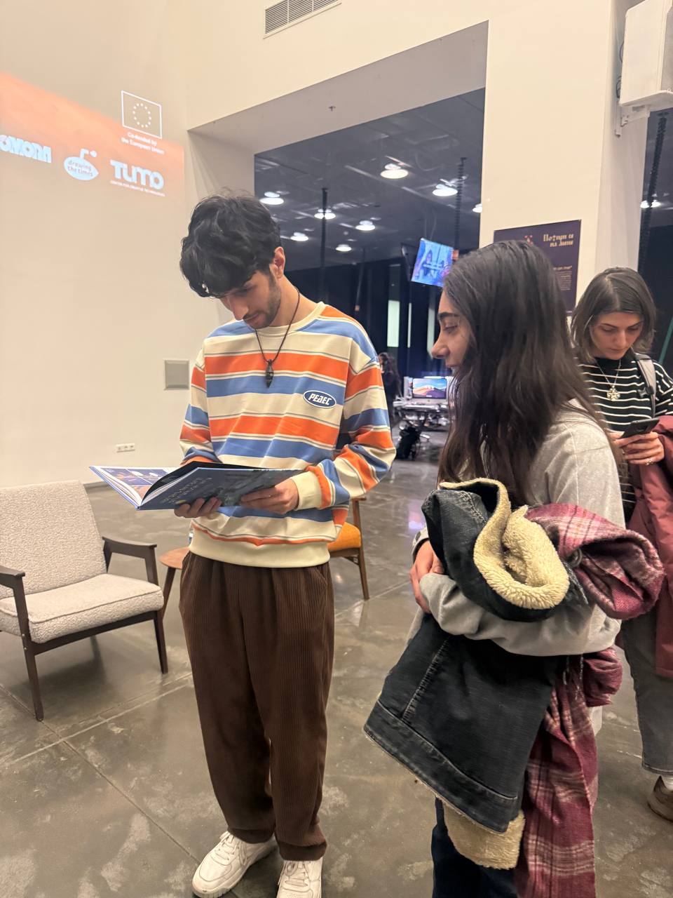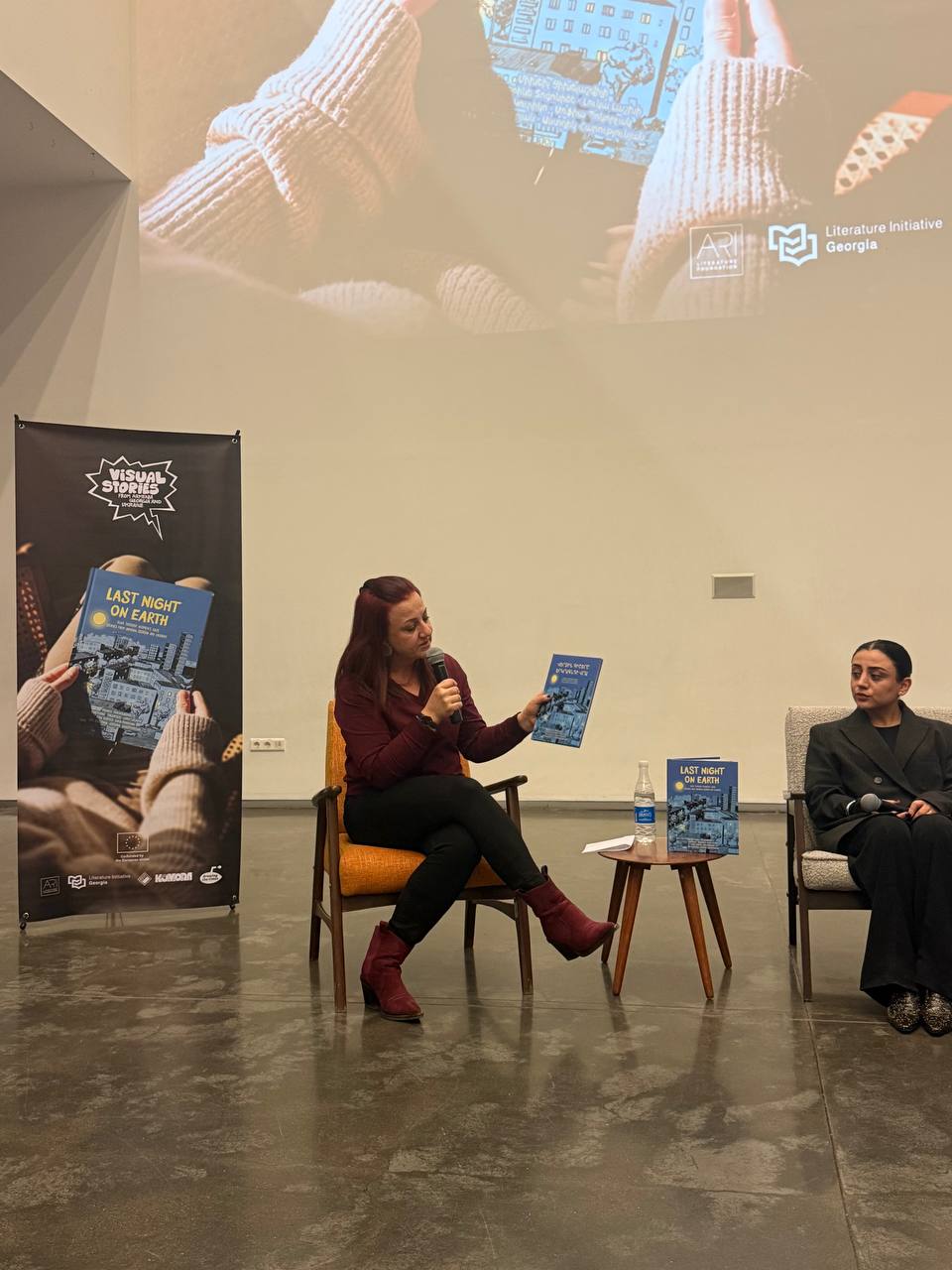During the presentation, the author of the Armenian story, Ani Asatryan and the illustrator Astghik Harutyunyan, spoke in depth about the project. They described how the idea was born and gradually transformed into a completed work, outlining the creative choices, research, and collaborative process behind it. They also discussed the challenges of portraying war through visual storytelling—finding the right balance between artistic expression and emotional truth. Both Astghik and Ani reflected on how the project influenced them personally and professionally, shaping their perspectives, strengthening their artistic voices, and leaving a lasting impact on their creative journeys.